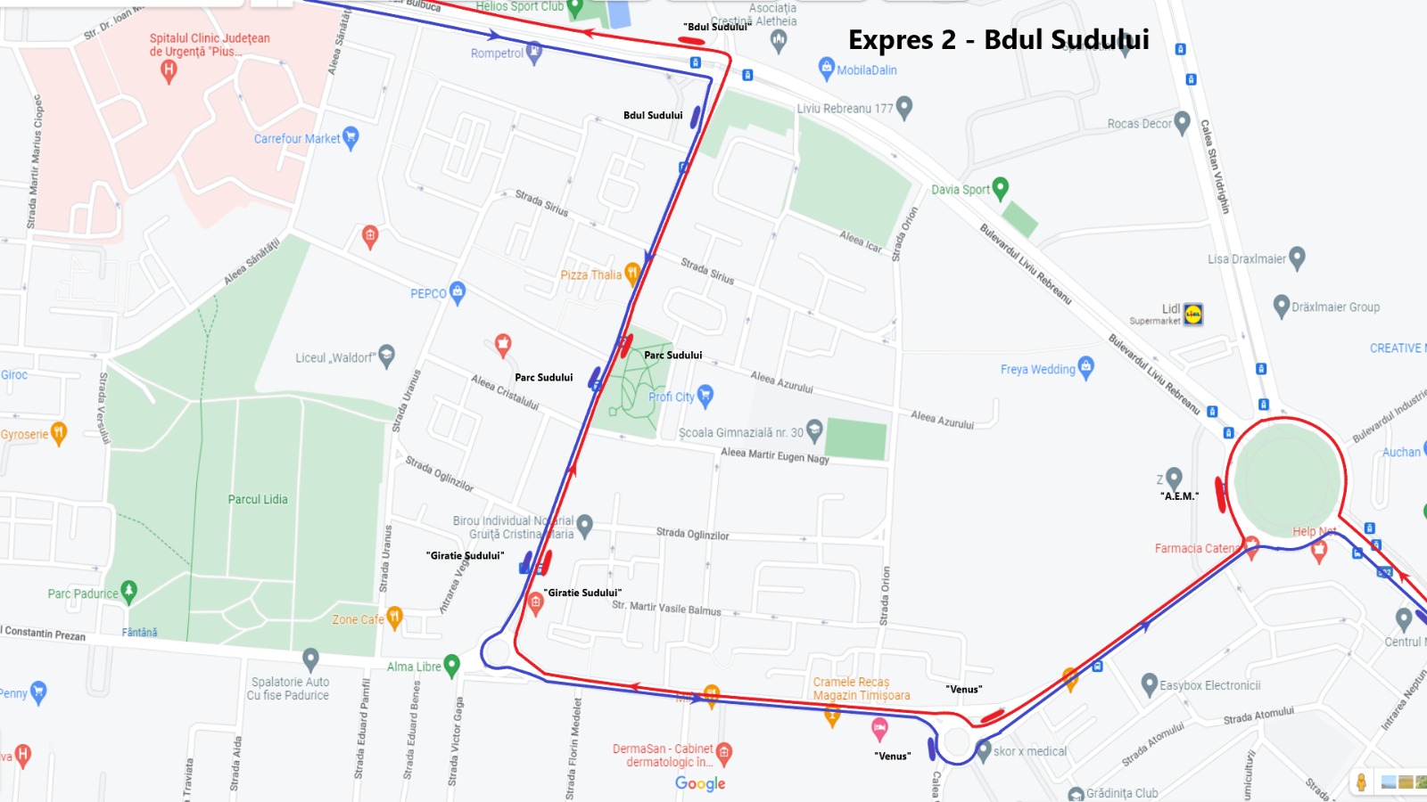 Linia Expres 2 va avea următorul traseu dus-întors: traseul existent de la Continental până în Piaţa Gheorghe Domăşneanu – apoi pe strada Venus – bulevardul Sudului, cu revenire pe traseul anterior, bulevardul Dr. Iosif Bulbuca (bulevardul Liviu Rebreanu)- strada Arieş – Complexul Studenţesc – Bastion – Piaţa Mărăşti – Iulius Town – strada Sf. Apostoli Petru şi Pavel.
