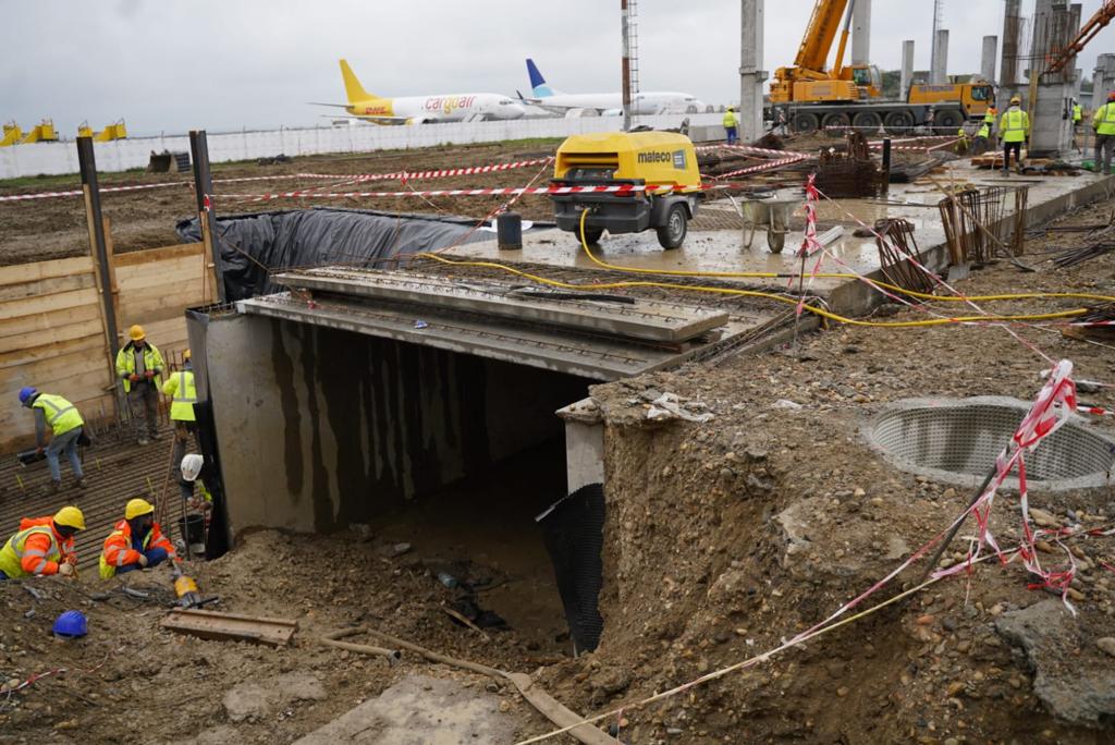 „Am ieșit din pământ. Tunelul de subtraversare este finalizat, acum lucrăm la partea de montaj stâlpi. O să trecem la finalizarea rampei, pe partea de descărcare de bagaje la terminalul de sosiri. Am lucrat în condiții destul de grele de iarnă, de frig, de ploaie”, spune reprezentantul societății constructoare.