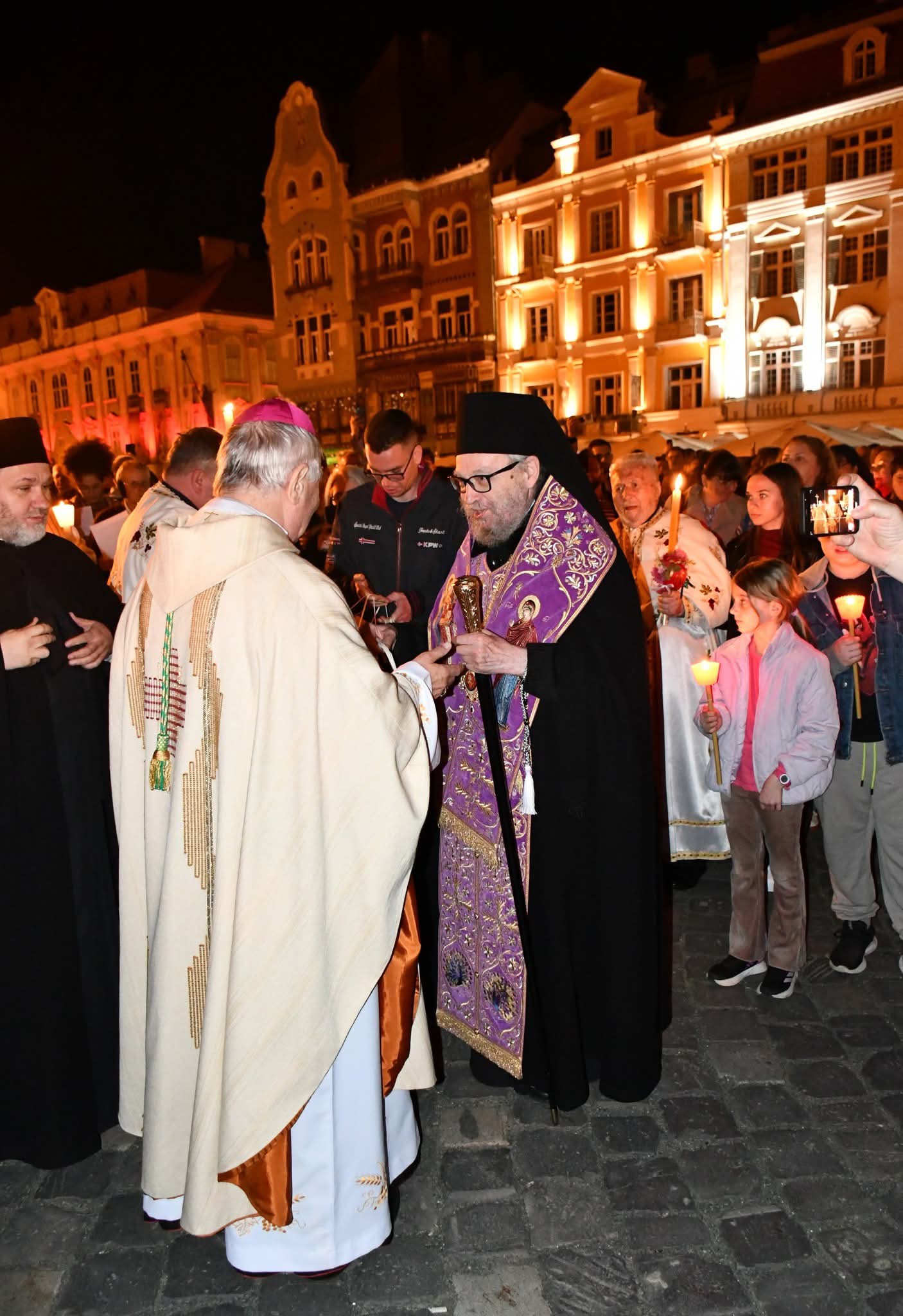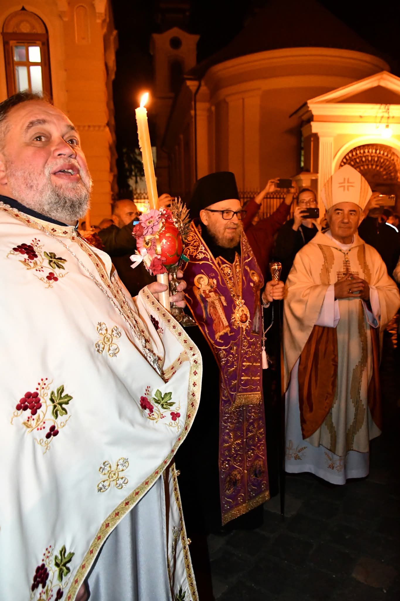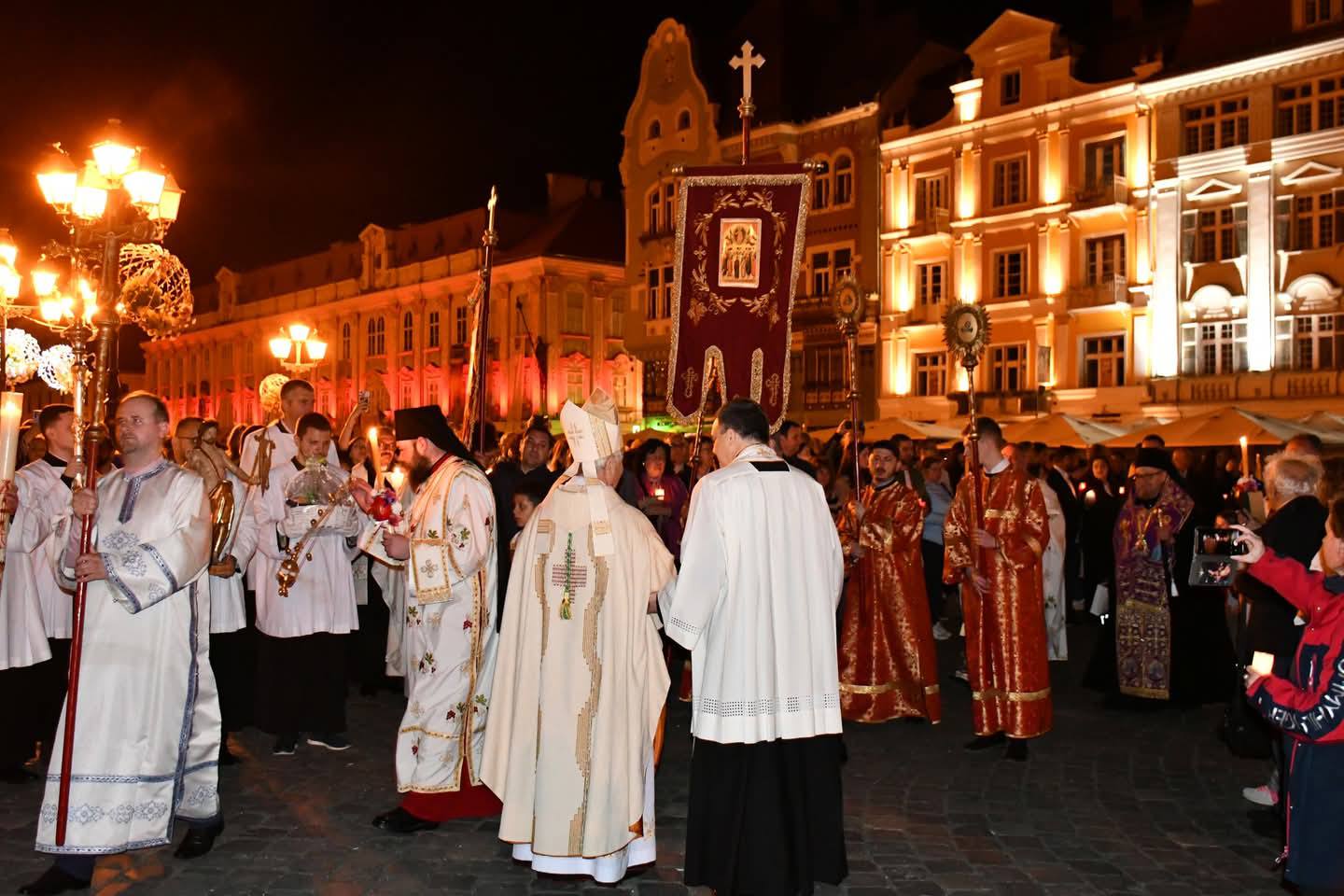 ”Slujba festivă a Învierii a început cu o procesiune în jurul sfintei biserici din Piața Unirii. Având în vedere că în acest an Biserica Romano-Catolică sărbătorește Paștele în același timp cu noi, iar Domul Romano-Catolică se află în aceeași piață cu cea sârbă, s-a produs un eveniment care nu are loc în fiecare zi – procesiunea condusă de mitropolitul Lukjan, care cu această ocazie s-a alăturat procesiunii conduse de Episcopul Romano-Catolic al Unirii, Josef Csaba Pal. S-au întâlnit în Piața Romano-Catolică. s-au felicitat unii pe alții cu ocazia sărbătorii sărbătorilor. Apoi au continuat drumul spre sfintele temple pentru a continua slujba de Paște”, a anunțat Eparhia Ortodoxă Sârbă.